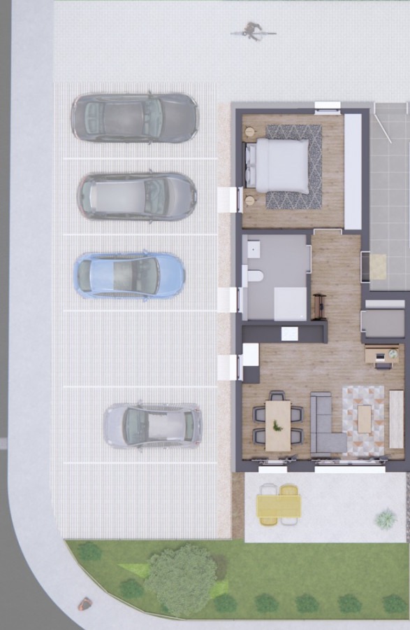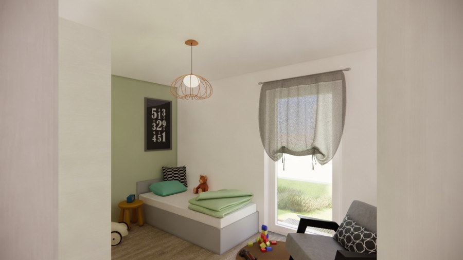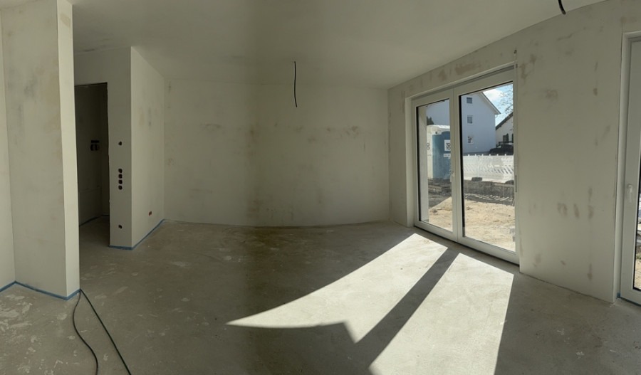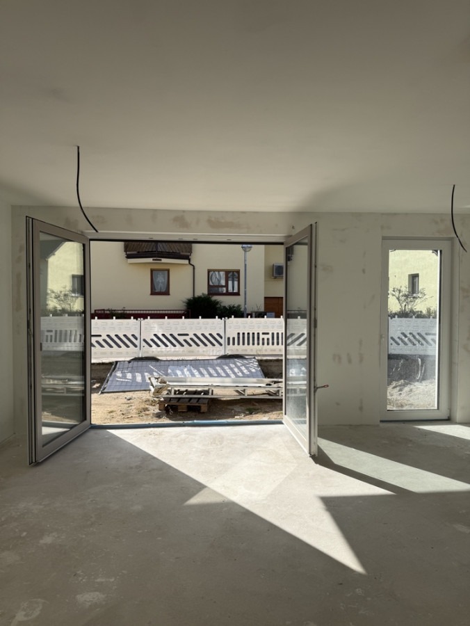 Im Wohn-/Essbereich lassen große bodentiefe Fenster viel natürliches Licht herein, während die 3-fach-Verglasung den Wärmeverlust senkt und den Schallschutz von Außen erhöht. Während der warmen Jahreszeit geht es von hier aus nahtlos ins Freie über und die Terrasse vergrößert den Wohnbereich nach Draußen. Gestalte Garten und Terrasse nach deinen eigenen Vorstellungen und hier entsteht der perfekte Ort für Grill und gern gesehene Gäste.