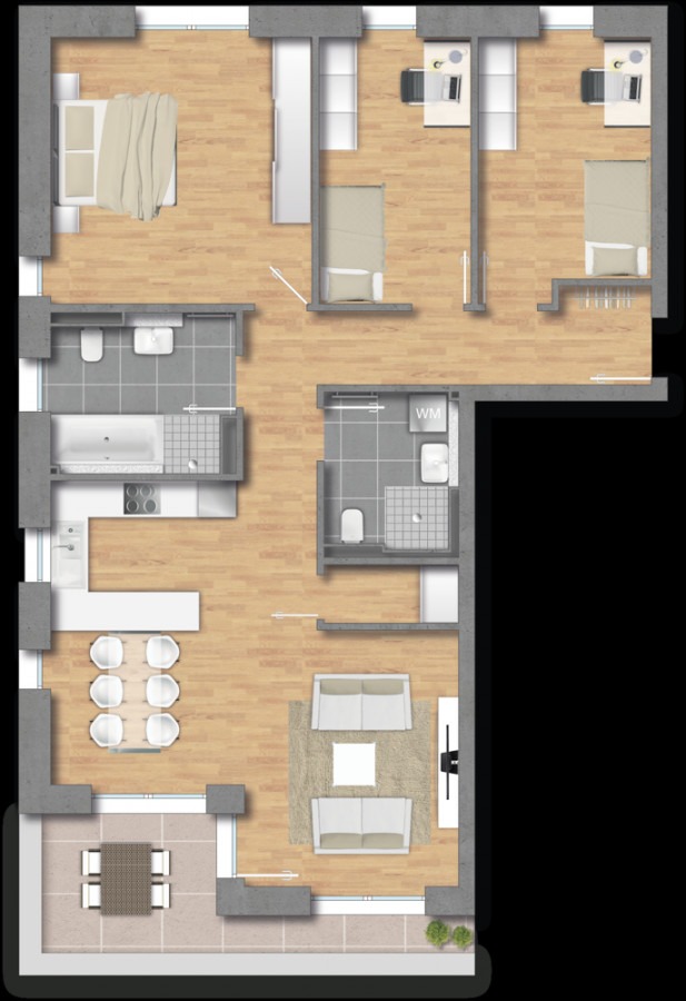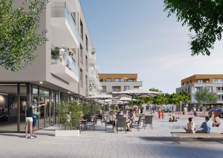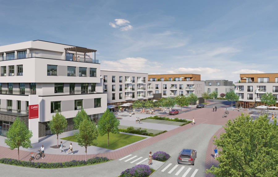 Diese attraktive Eigentumswohnung befindet sich in Haus D des CARRÉ AM MARKT. Auch hier profitieren Sie von der Nähe zum Quartiersplatz als öffentlicher Treffpunkt für alle Generationen. Der Zugang ins Haus ist barrierearm gestaltet und durch den Personenaufzug gelangen Sie bequem in Ihre Wohnetage. Willkommen in Ihrer neuen Wohnung: Mit 3 Schlafzimmern und zwei Bädern auf einer Wohnfläche von ca. 101 m² wohnen Sie großzügig auf einer Ebene und sind für viele Lebenslagen vorbereitet. Die bodentiefen Fenster lassen viel natürliches Licht in die Räume. Alle Wohn- und Schlafräume sind mit pflegeleichtem Vinylboden ausgestattet, während die Bäder modern gefliest sind. Während das Tageslichtbad mit Dusche und Badewanne ausgestattet ist, bietet das zweite Bad ebenfalls eine begehbare bodengleiche Dusche und Platz für die Waschmaschine. Die Küche ist zum Wohn-/Essbereich hin offen. Durch den Abstellraum sind Vorräte beim Kochen schnell griffbereit. Durch die bodentiefen Fenster sind Sie mit einem Schritt im Freien und können von Ihrer Loggia mit Südausrichtung die Sonne genießen.